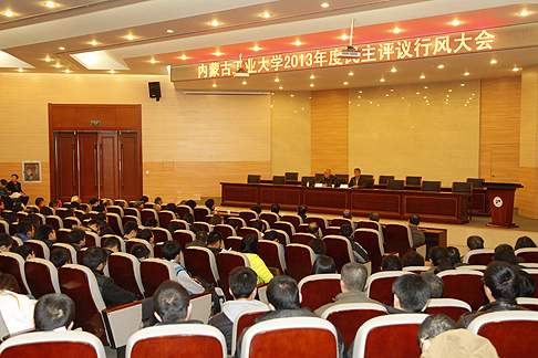 12月12日下午,内蒙古工业大学2013年度民主评议大会在新城校区第三教学楼报告厅举行。自治区高校纪工委评议组组长、自治区高校纪工委原书记程哲等一行五人莅临我校开展民主评议工作。刘志雄代表学校作题为《转作风 促行风 办好师生满意、人民满意的工业大学》的工作报告。校党委书记刘振洪、校长邢永明,副校长姚德、黄龙海、黄雅丽、栗文义、峻峰出席大会。我校教师代表、学生代表和离退休人员代表和行政人员代表400余人参加大会。