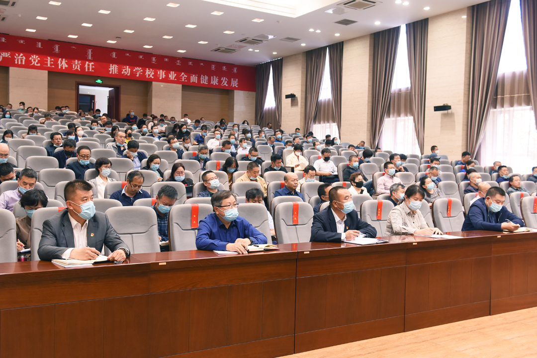 校党委书记刘志彧讲话。他从政治建设取得新成效、主题教育取得新成果、基层党建开创新亮点、思政工作展现新面貌、党管人才实现新突破、纪律建设迈上新台阶6个方面,全面回顾了学校过去一年党的建设和全面从严治党工作取得的成绩;总结了学校学科建设、专业建设、科学研究、办学条件方面取得的新突破;并客观分析了工作中存在的短板不足,要求大家清醒认识当前面临的严峻形势,始终保持清醒头脑和高度警觉,在今后工作中认真研究解决。